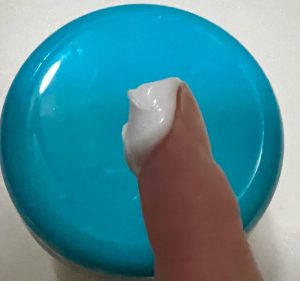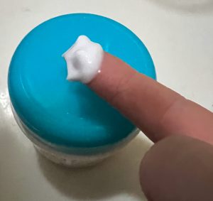- 「モイスチャライジングクリームジャー」を人差し指に小盛りくらいとって、手のひら全体に伸ばして顔に押し付ける感じで擦らず広げる